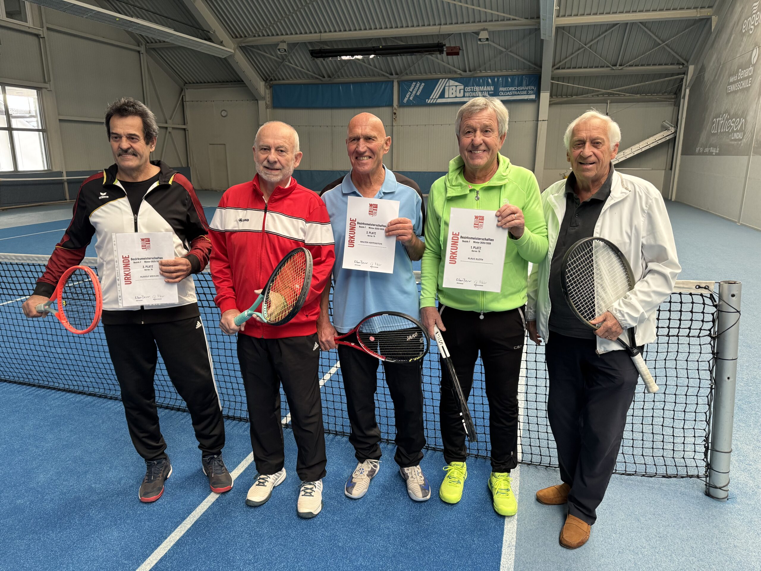 In der AK 75/80 dominierten die TCL-Senioren. Ohne Niederlage holte sich Klaus Kloth erstmals den Titel Bezirksmeister. Walter Hertenstein wurde Zweiter und das Siegerpodest vervollständigte Frank Müller-Thoma als Dritter. Insgesamt also ein schöner Erfolg für die Senioren des TC Langenargen und ein erfolgreicher Start ins neue Tennisjahr 2026.kk